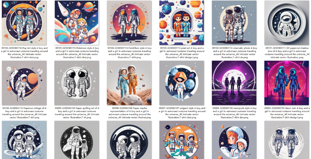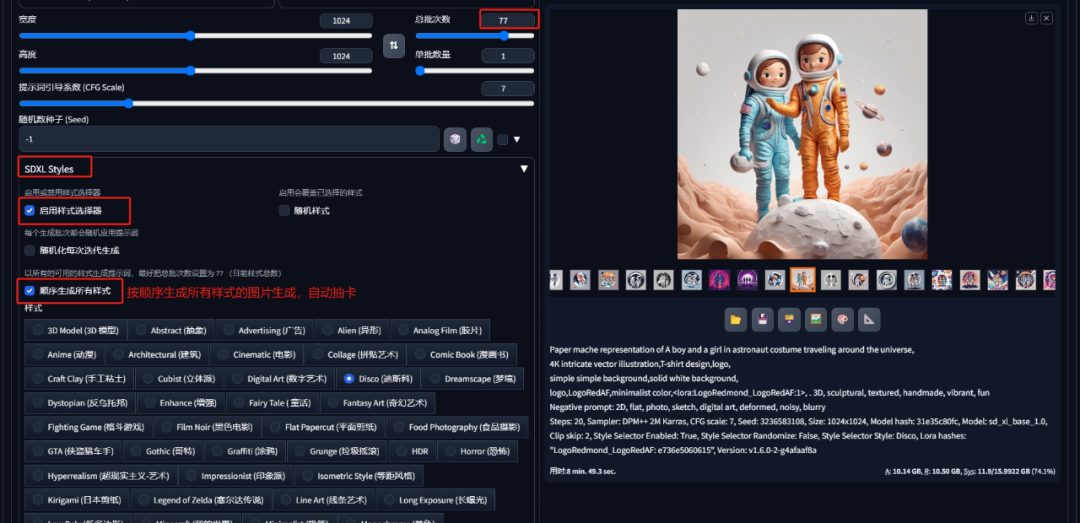 当我们勾选了【按顺序生成所有样式】,总批次改为77,一个神奇的事情就发生了,SD可以自动抽卡,各种主题样式的图案一键生成!