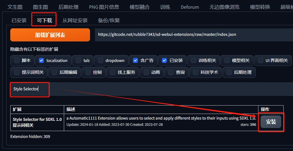 有时候,我们并不清楚想要什么样的图案,通过提示词调整又太麻烦,这时候,刚刚安装的样式选择扩展就派上用场了。