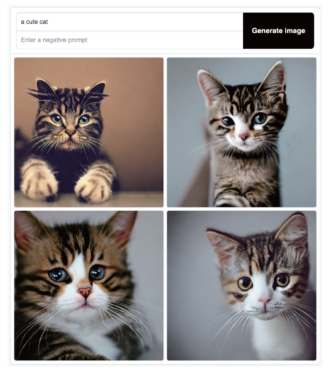 什么是 AI 绘画呢?AI 绘画是指使用人工智能算法生成图像或绘画作品,它基于机器学习模型,可以接受不同的提示词、引导图等作为输入参数来生成各种风格和内容的视觉艺术品。比如,图 1 就是给 AI 输入提示词 a cute cat 得到的绘图结果。