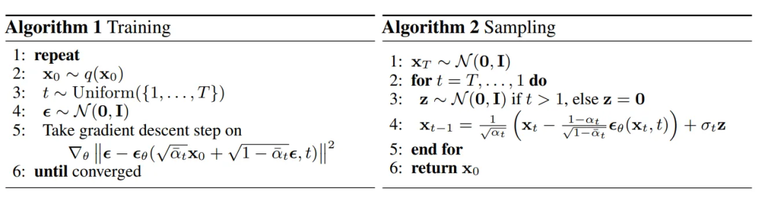 5 DDPM 训练过程和采样过程的伪代码如下图所示。由于 DDPM 的高质量生成依赖于较大的 T(一般为 1000 以上),导致 Diffusion 前向过程特别缓慢,因此后续进一步有了 DDIM、PLMS 和 Euler A 等一些优化版采样器。