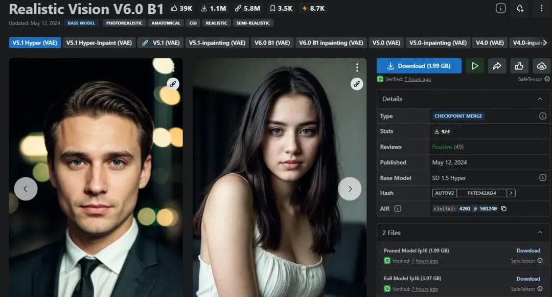 真实系比较出名的模型有Realistic Vision等,这是C站上放出的一些图片,可以看到确实非常逼真了