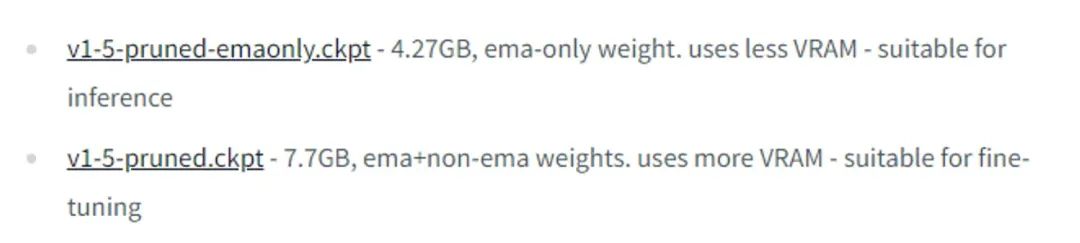 由于带 pruned-emaonly 的模型体积更小,所以占用的显存(VRAM)也更少,适合用于直接出图;带 pruned 的模型体积更大,占用的显存也更多,更适合对其进行微调,如下图: