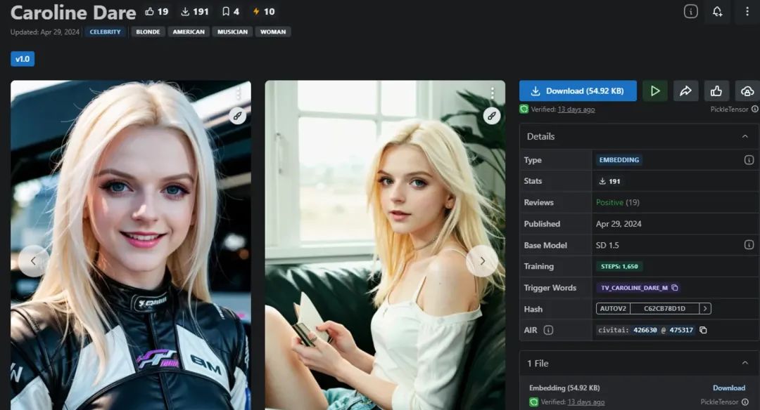 举个例子,比如像这个 Embedding 模型,它描绘了一位叫Caroline Dare的美女