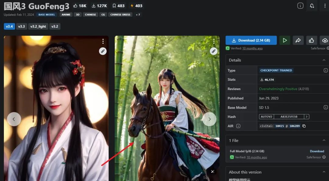 由于这类模型包含的素材非常多,训练的时间也非常长,所以体积也比较大,一般在2GB以上,后缀的话就是上面提到的 .ckpt 和 .safetensors