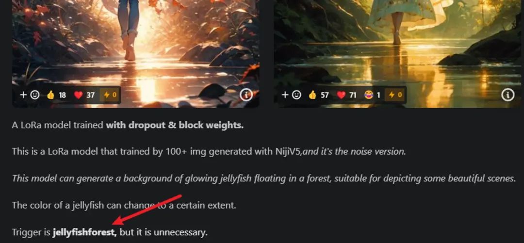 最后,有些Lora模型启用是需要触发词的(也就是在提示词那里加上这个触发词),比如上面的Lora触发词就是 jellyfishforest