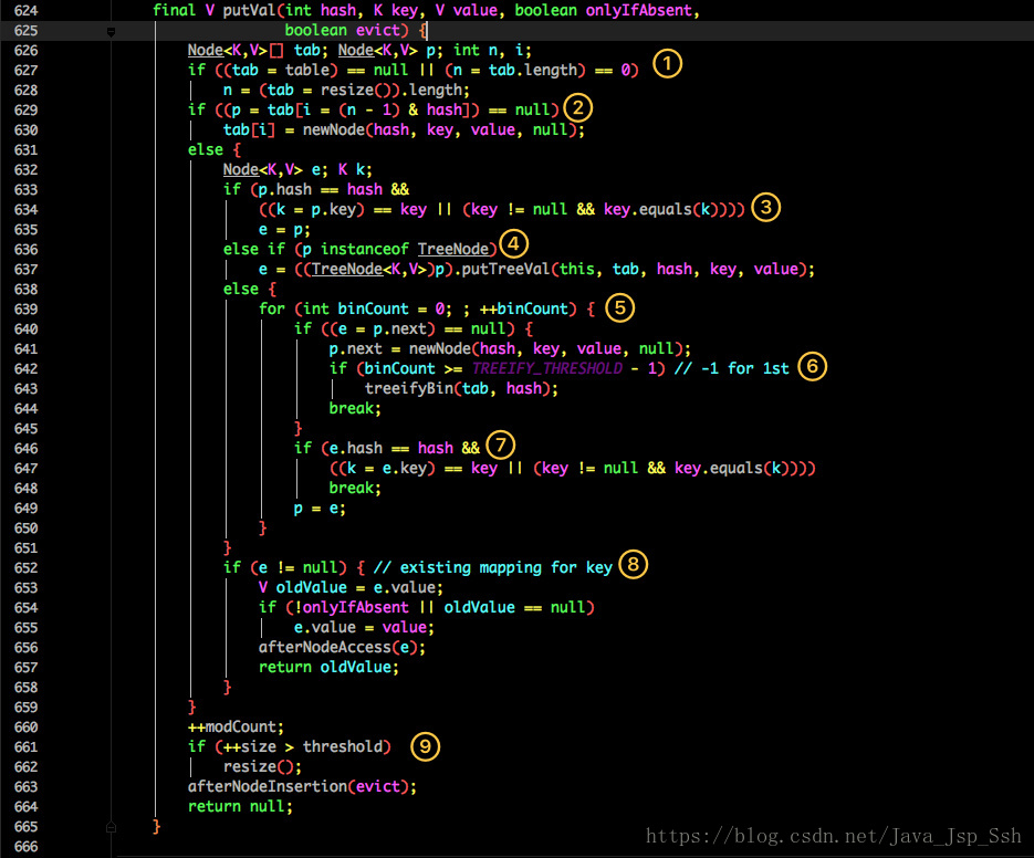 - 如果桶是一个链表则需要遍历判断里面的 hashcode、key 是否和传入 key 相等,如果相等则进行覆盖,并返回原来的值。