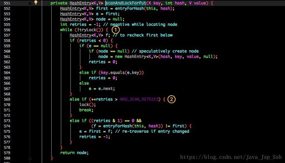 首先第一步的时候会尝试获取锁,如果获取失败肯定就有其他线程存在竞争,则利用 scanAndLockForPut() 自旋获取锁。