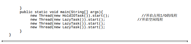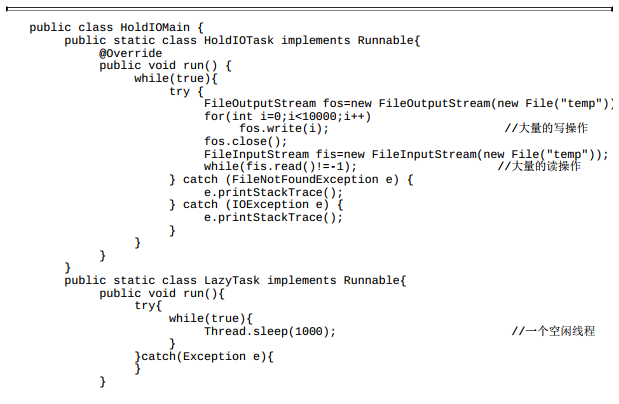 磁盘I/O也是常见的性能瓶颈之一。使用pidstat也可以监控进程内线程的I/O情况。下面的代码开启了4个线程,其中,线程HoldIOTask产生了大量的I/O操作。