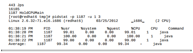 运行以上程序,要监控该程序的CPU使用率,可以先使用jps命令找到Java程序的PID,然后使用pidstat命令输出程序的CPU使用情况。执行命令如下: