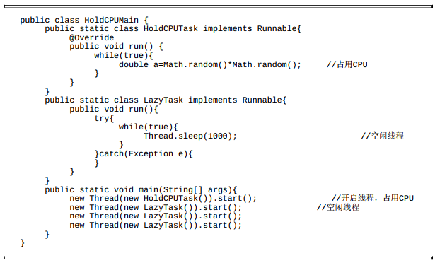 下面是一个简单的占用CPU的程序,它开启了4个用户线程,其中1个线程大量占用CPU资源,其他3个线程则处于空闲状态。