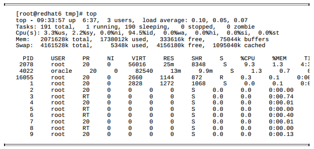 第2行是进程统计信息, 包括总进程数、 正在运行的进程数、 睡眠 进程数、 停止的进程数和僵尸进程数。 第3行是CPU的统计信息: us表 示用户空间CPU占用率; sy表示内核空间CPU占用率; ni表示用户进程 (改变过优先级的进程) CPU占用率; id表示空闲CPU占用率; wa表示 等待输入/输出的CPU时间百分比; hi表示硬件中断请求的CPU时间百分 比; si表示软件中断请求的CPU时间百分比; st表示在虚拟机中运行时 等待CPU的时间。 在Mem行中, 从左到右依次表示物理内存总量、 已使 用的物理内存、 空闲物理内存和内核缓冲的使用量。 Swap行依次表示 交换区总量、已使用的交换区大小、空闲交换区大小和缓冲交换区大小。