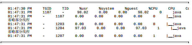 -t参数将系统性能的监控细化到线程级别。从输出结果中可以看到,该Java应用程序之所以占用如此高的CPU,是因为线程1204的缘故。