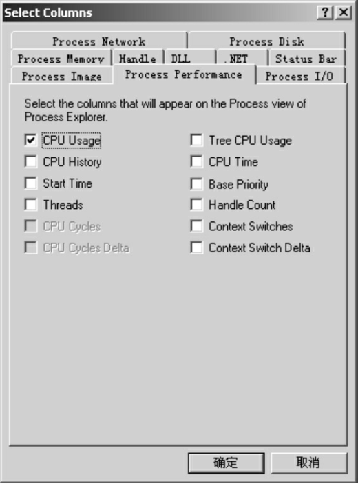 ProcessExplorer不仅显示了系统内所有的进程,还进一步显示了进程间的父子关系。ProcessExplorer所支持的测量项非常多。可以在表格头部右击,选择SelectColumns命令,打开对话框,选择需要统计的策略项。如图6.13所示,ProcessExplorer将统计项进行了分类,主要有进程模块信息、进程性能、I/O使用情况、网络使用情况、内存使用情况等选项卡。