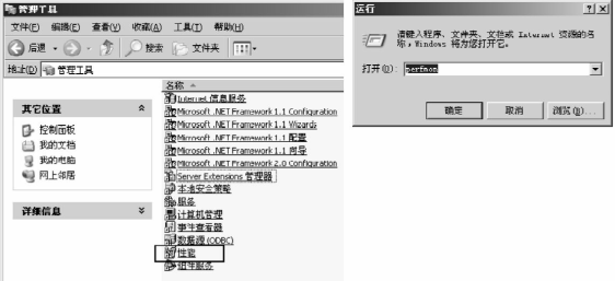 读者可以在任务栏的“开始”菜单中选择“运行”命令,在弹出的“运行”对话框中使用perfmon命令,或者在控制面板的管理工具中双击“性能”快捷方式打开perfmon工具,如图7所示。