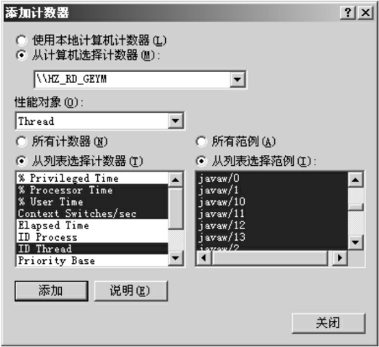 perfmon工具的底部表格显示了当前正在监控的系统对象。可以在监控对象表格中右击,在弹出的快捷菜单中选择“添加计数器”命令,在弹出的“添加计数器”对话框中选择需要监控的对象,如图8所示。