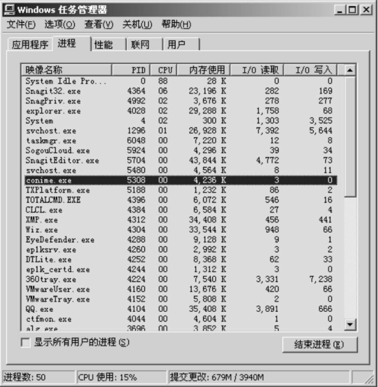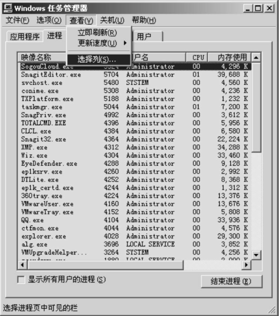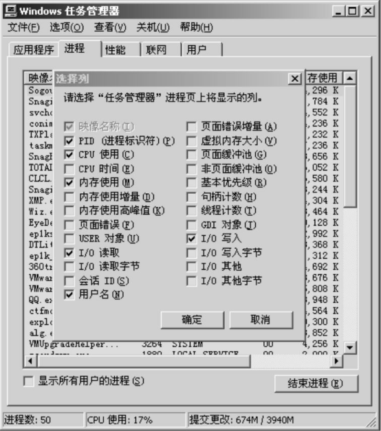 除了图1中所展示的列外,任务管理器的进程页面还可以显示更多的性能参数,如进程ID和I/O信息等,如图2所示。