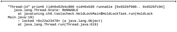 可以看到,在该Java程序中,线程的上下文切换数值和CPU占用率都比较大。查看当前CPU占用率达12%、上下文切换达163次的线程ID为2864的线程,换算成十六进制为b30。在线程快照中,查找b30对应的线程,有以下结果: