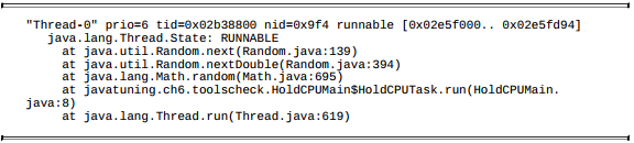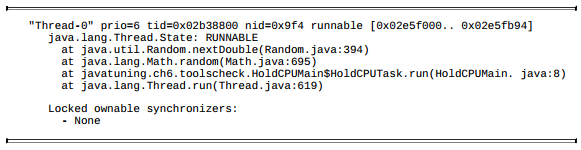 读者应该还记得在介绍pidstat工具(6.1.5节)时使用的HoldCPUMain程序吧,本节将以该程序为例,展示如何使用perfmon工具找出在Java应用程序中最消耗CPU资源的线程。