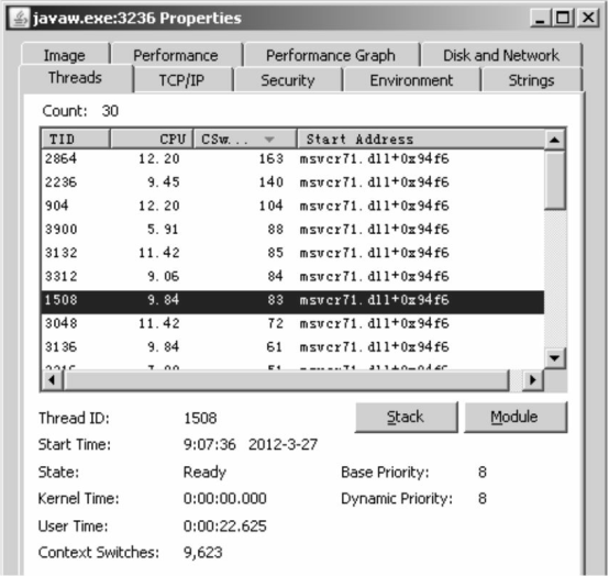 右击javaw.exe,打开属性对话框,在其中查看线程页,如图15所示。