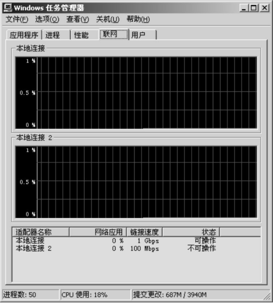 除了对进程进行单独的监控外,任务管理器还能对计算机系统的整体运行情况进行监控,包括CPU、内存及网络的使用情况。图4展示了CPU的实际使用率和内存使用情况,图5展示了当前的网络使用情况。