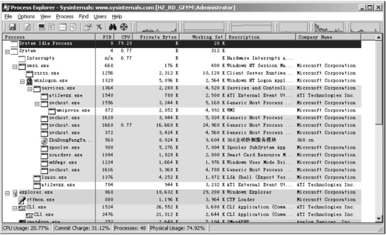 ProcessExplorer是一款功能极其强大的进程管理工具,完全可以替代Windows自带的任务管理器。读者可以
