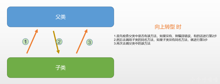 由此我们可以知道当发生向上转型,去调用方法时,首先检查父类中是否有该方法,如果没有,则编译错误;如果有,再去调用子类的同名方法。如果子类没有同名方法,会再次去调父类中的该方法