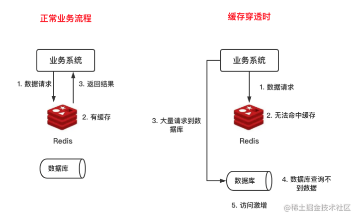 缓存击穿与缓存雪崩的情况相似,雪崩是因为大量的数据过期,而缓存击穿则是指热点数据过期,所有针对热点数据的请求都需要到数据库中进行处理,如下图所示: