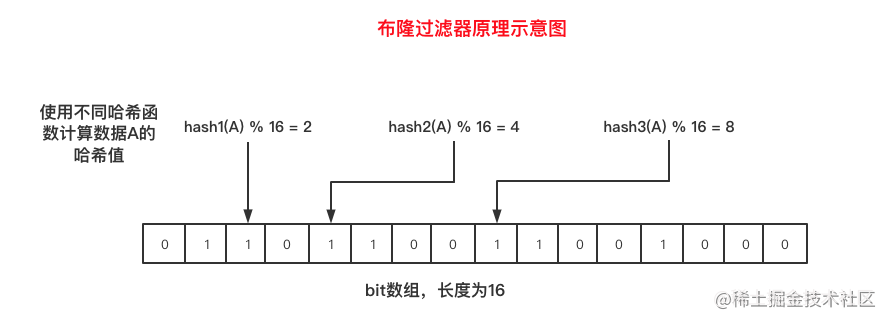 布隆过滤器主要是两个部分:bit数组+N个哈希函数,其原理为: