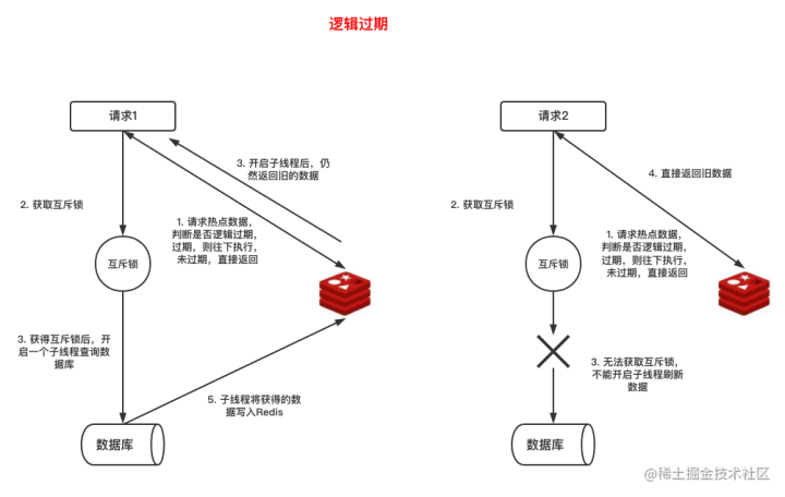 当一个请求拿到Redis中的数据时,判断逻辑过期时间是否到期,如果没有到期,直接返回,如果到期则开启另一个线程获得锁后去查询数据库并将查询的最新数据写回Redis,而当前请求返回已经查询的数据。