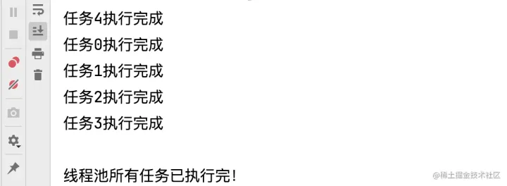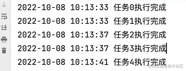// 创建线程池 ThreadPoolExecutor threadPool = new ThreadPoolExecutor(10, 20, 0, TimeUnit.SECONDS, new LinkedBlockingDeque<>(1024)); final int taskCount = 5; // 任务总数 // 循环计数器 Semaphore semaphore = new Semaphore(2); // 添加任务 for (int i = 0; i < taskCount; i++) { final int finalI = i; threadPool.submit(new Runnable() { @Override public void run() { try { // 获取信号量 semaphore.acquire(); // 随机休眠 4s TimeUnit.SECONDS.sleep(4); SimpleDateFormat sdf = new SimpleDateFormat("yyyy-MM-dd HH:mm:ss"); String format1 = sdf.format(new Date()); System.out.println(String.format("%s 任务%d执行完成", format1, finalI)); } catch (InterruptedException e) { e.printStackTrace(); } finally { semaphore.release(); } } }); } 复制代码