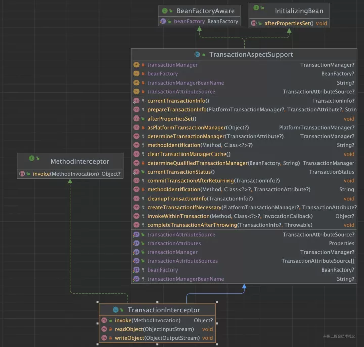 从类图首先可以看到,为了能够察觉到方法的调用,事务拦截器实现了方法拦截器接口(MethodInterceptor)的invoke方法,在invoke方法中先判断当前执行的方法属于哪个类,紧接着会用invokeWithinTransaction()对方法进行事务性的包装。其源码如下: