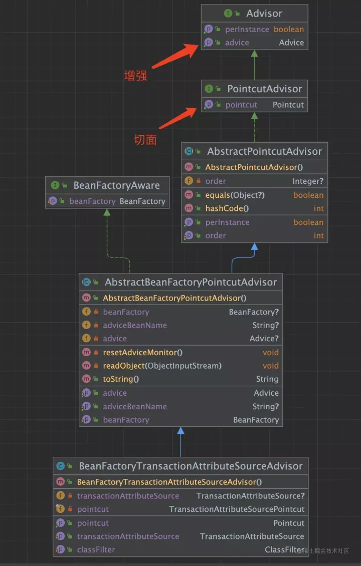 从类图上可以看到,其继承了AbstractPointcutAdvisor关键模版类,该类是Spring中用于定义切点和增强逻辑。通过指定PointCut和Advice,就可以实现自定义的增强逻辑。因此,Bean工厂事务属性源指导只要将事务拦截器标记为增强逻辑,将注释事务属性源标记为切点,就可以让其在Spring中作为AOP生效。