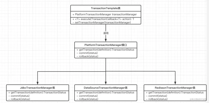 为此,Spring专门设计了接口PlatformTransactionManager,其主要负责对外提供三个方法:getTransaction(definition)、commit(status)、rollback(status)。就用来抽象的上述的三个功能。由此一来,应用层的代码实现类(这里以TransactionTemplate为例子)就不再需要依赖于我的数据源究竟是JDBC、Redission还是DataSource。面对抽象编程,从而减少了接入需要考虑不同类型所带来的成本。