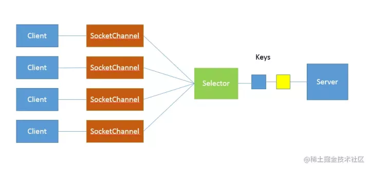 这个非常精简的样例掀开了 NIO 多路复用的面纱,我们可以分析下主要步骤和元素: