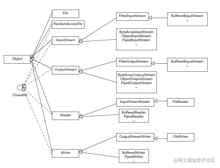 参考下面这张类图,很多 IO 工具类都实现了 Closeable 接口,因为需要进行资源的释放。比如,打开 FileInputStream,它就会获取相应的文件描述符(FileDescriptor),需要利用 try-with-resources、 try-finally 等机制保证 FileInputStream 被明确关闭,进而相应文件描述符也会失效,否则将导致资源无法被释放。利用 Cleaner 或 finalize 机制作为资源释放的最后把关,也是必要的。