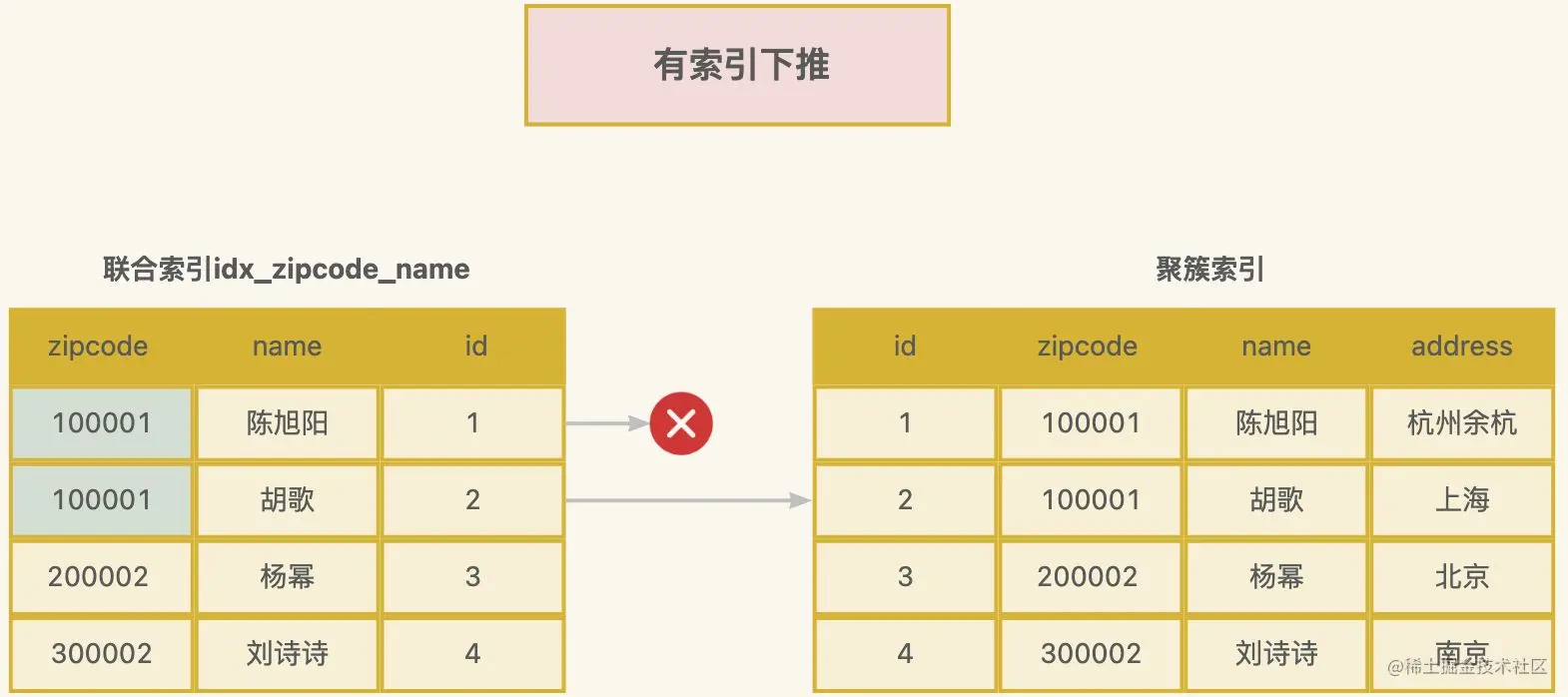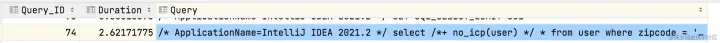 select /*+ no_icp(user) */ * from user where zipcode = '10018' and name like '%李%'; 复制代码