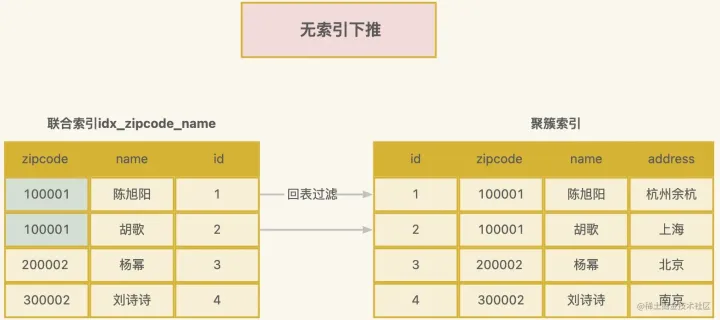 联合索引中知道100001的数据项,因为name是全模糊,无法走索引,address压根没有索引,他们无法在联合索引中过滤,怎么办?只能回到数据最全的聚簇索引上进行name like '%陈%' and address like '%余杭%'这个逻辑的过滤。