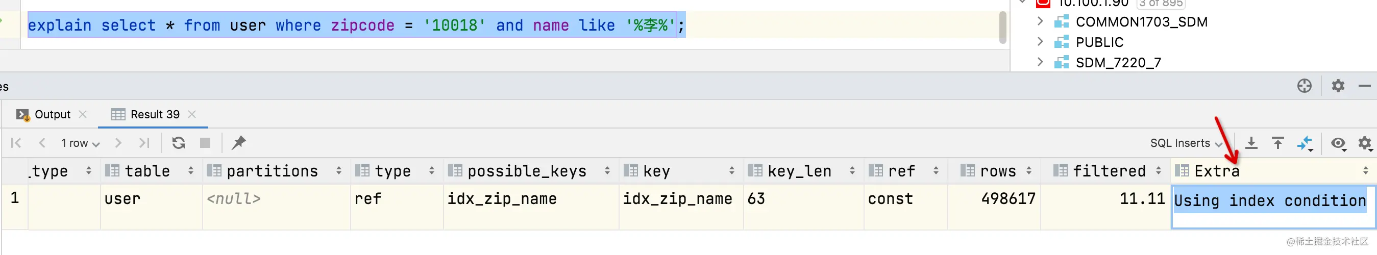 我们利用explain查看SQL的执行计划时,如果发现Extra字段中有Using index condition,即表示使用到了索引下推。