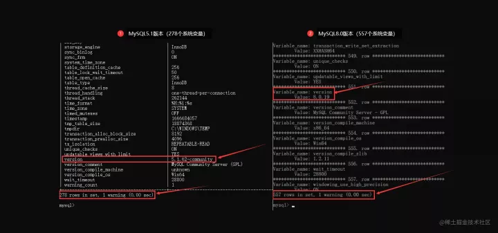 可以很明显的从结果中得知:MySQL5.1版本中存在278个系统变量,MySQL8.0版本中存在557个系统变量,这仅仅只是社区版,而在商业版的MySQL中,其系统参数会更多,下面调出一些重点来聊一聊。
