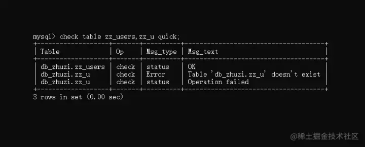 这回的结果出现了些许不同,Msg_text中出现了一个Error信息,提示咱们检查的zz_u表不存在,而对于一张存在的zz_users表,则返回OK,表示没有任何问题。