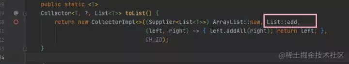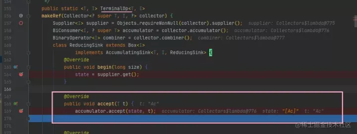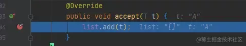 最后呢,是来到终止操作 TerminalOp 中的 accept,这里执行的是 list 的 add 方法(我们调用 Collectors.toList() 中构建的),至此,数据添加到 state 中
