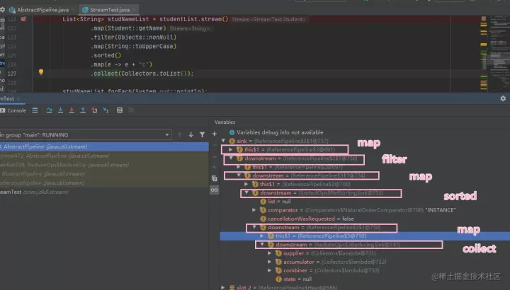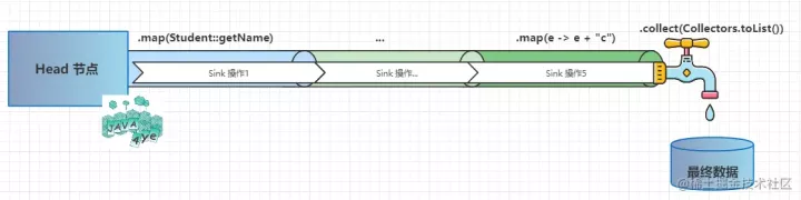 Student aStud = new Student(1, "a"); Student bStud = new Student(2, "b"); Student cStud = new Student(3, null); // 集合的创建 一 List<Student> collect1 = Stream.of(aStud, bStud, cStud).collect(Collectors.toList()); collect1.forEach(System.out::println); List<String> studNameList = studentList.stream() .map(Student::getName) .filter(Objects::nonNull) .map(String::toUpperCase) .sorted() .map(e -> e + "c") .collect(Collectors.toList()); 复制代码