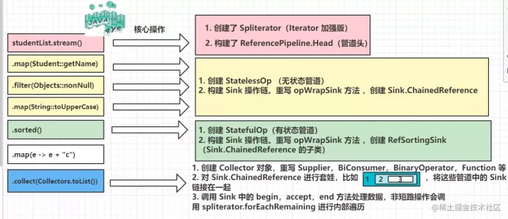 利用 wrapSink 方法将各个中间操作中的 Sink 嵌套在一起,然后来到 copyInto 方法,调用 begin 通知各个 Sink 做好准备,接着进行内部迭代调用 accept 方法,再调用 end 方法完成数据的操作,最后通过 get 方法,获取新容器中的数据,便是结果了。