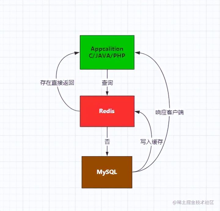 正常的项目业务中,往往读请求的数量远超写请求,如果将所有的读请求都落入数据库处理,这自然会对MySQL造成巨大的访问压力,严重的情况下甚至会由于流量过大,直接将数据库打到宕机,因此为了解决这系列问题,通常都会在应用程序和数据库之间架设一个缓存,例如最常用的Redis,关系图如下: