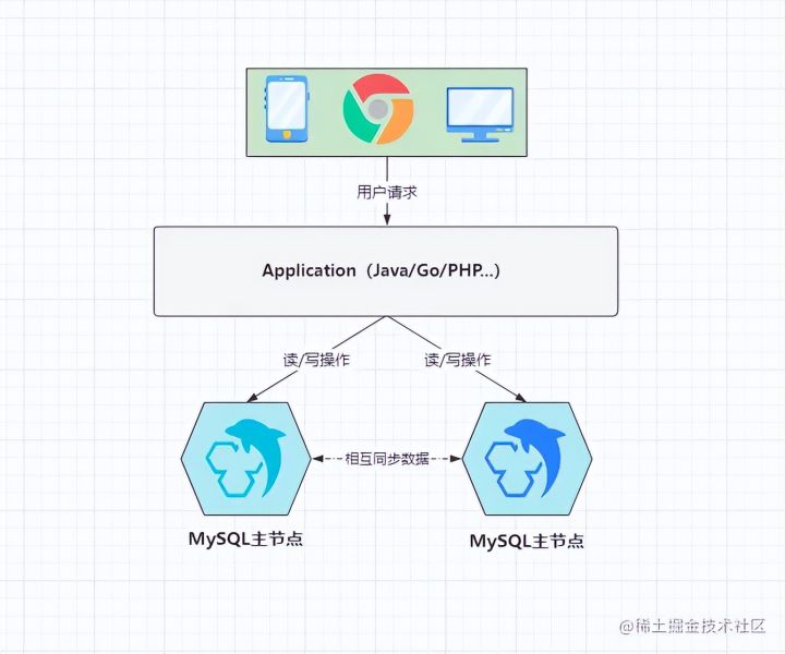 似乎看起来和之前的图差不多,但在这里的两个MySQL节点都为主,同时它们也都为从,啥意思呢?其实就是指这两个节点互为主从,两者之间相互同步数据,同时都具备处理读/写请求的能力,当出现数据库的读/写操作时,可以将请求抛给其中任意一个节点处理。
