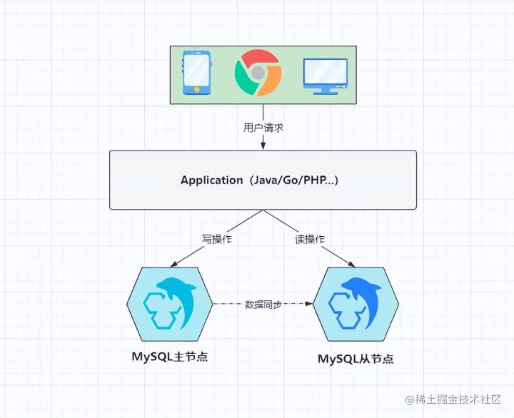 在上图中就是一个典型的主从架构,但如果从节点仅仅只是作为一个备胎,这难免有些浪费资源,因此可以在主从架构的模式下,再略微做些调整,即实现读写分离,由于读操作并不会变更数据,所以对于读请求可以分发到从节点上处理,对于会引发数据变更的写请求,则分发到主节点处理,这样从而能够进一步提升MySQL的整体性能。