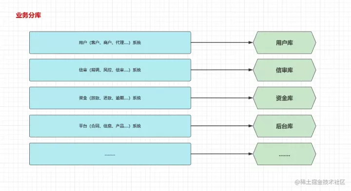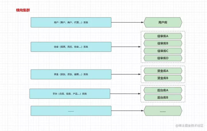 而数据库这边经过拆分之后,相较于之前的单库架构,整个数据库系统的稳定性和可用性明显得到改善,但由于某些库是经常需要被访问到的(资金库、信审库、后台库),所以这些核心库以单节点方式去承载流量还是显得有点吃力(吞吐量下降、响应速度变慢),最终又对核心业务库进行横向扩容,架构如下: