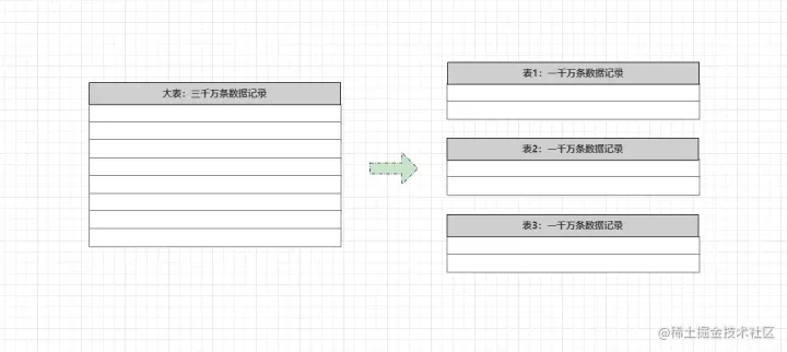 例:现在有一张表,里面有三千万条数据记录,当基于该表去执行一条在索引上的复杂SQL时,也需要一定时间,至少会比1000万的数据表慢了好几倍,此时可以把这张3000W的表,拆为三张1000W的表,如下: