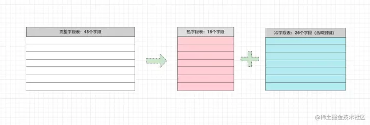 例:现在有一张表,总共43个字段,但是对于程序来说,一般经常使用的字段不过其中的十余个,而这些经常使用的字段则被称之为热点字段,假设此时这张表中的热点字段为18个,剩下的冷字段为25个,那么我们就可以根据冷热字段来对表进行拆分,如下:
