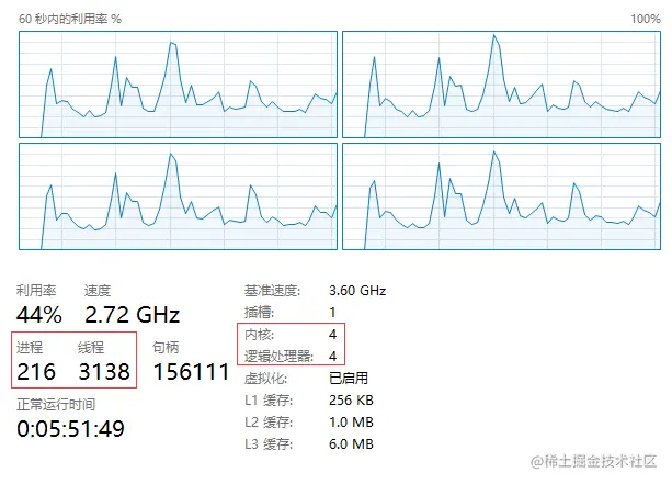 但无论是小核、大核、大小核架构的CPU,本质上在机器运行期间,往往整个系统内所有程序的线程数,加起来之后都会远超于CPU核数,如下: